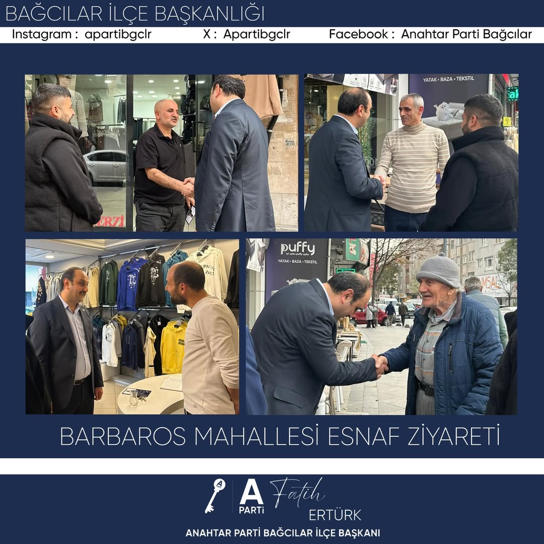 Anahtar Parti Bağcılar İlçe Başkanlığı olarak, İlçe Başkanımız, yönetim kurulu üyelerimiz ve Barbaros Mahallesi Başkanımız Harun Doğan ile birlikte Barbaros Mahallesi esnafımıza ziyaret gerçekleştirdik. Samimi karşılamaları, mahallemize dair paylaştıkları değerli görüşler ve içten sohbetleri için tüm esnafımıza teşekkür ediyoruz. Bağcılar’ın her mahallesinde vatandaşımızın yanında olmaya, sorunları yerinde dinlemeye ve çözüm üretmeye devam edeceğiz.