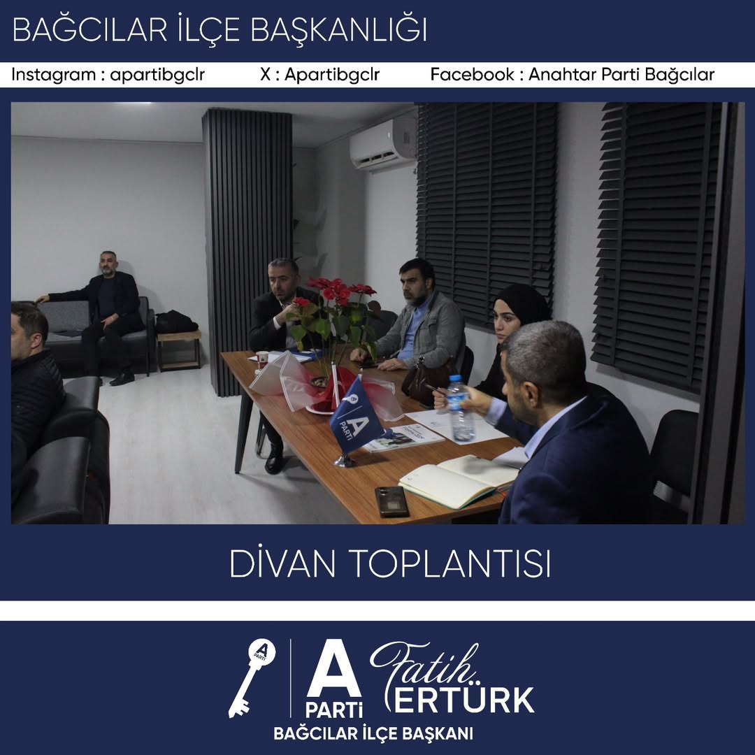 Anahtar Parti Bağcılar İlçe Başkanlığı olarak, İlçe Başkanımız Sn. Fatih Ertürk'ün başkanlığında yönetim kurulu toplantımızı gerçekleştirdik. Toplantımızda ilçe teşkilatımızın yürüttüğü çalışmalar değerlendirildi, önümüzdeki döneme dair planlamalar, mahalle teşkilatlarımızın faaliyetleri ve yerel düzeyde yürütülecek projeler istişare edildi. Anahtar Parti olarak, her adımımızda ortak aklı esas alıyor; birliğin, dayanışmanın ve samimiyetin ışığında hareket etmeye devam ediyoruz. Bağcılar'ın her mahallesinde güçlü bir teşkilat yapısıyla, halkımızın taleplerine duyarlı, çözüm odaklı bir anlayışı sürdüreceğiz.